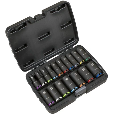 General description Manufactured from hardened and tempered Chrome Vanadium steel, this Premier Deep Impact Socket Set features a phosphate finish for added corrosion resistance. The WallDrive® sockets allow a transfer of up to 30% more torque to the fixing, making it ideal for professional use. The set includes colour-coded rings for fast identification and is supplied in a convenient storage case. It comes with a lifetime guarantee. Technical specifications Drive size: 3/8 inch Number of pieces: 17