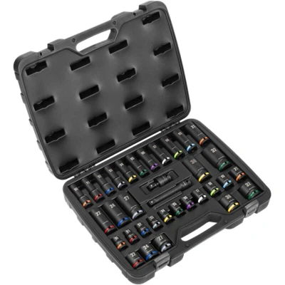 General description Sealey AK5635M Premier Impact Socket Set is a comprehensive 34-piece set designed for strength and durability. Manufactured from hardened and tempered Chrome Vanadium steel, it features a phosphate finish for added corrosion resistance. The set includes standard and deep sockets, an extension bar, and a universal joint, all supplied in a convenient storage case. Technical specifications Material: Chrome Vanadium steel Finish: Phosphate for corrosion resistance Socket types: Standard and deep sockets Contents: 34 pieces including sizes 10, 11, 12, 13, 14, 15, 16, 17, 18, 19, 21, 22, 24, 27, 30, 32mm Extension Bar: 125mm Universal Joint: Included Compatibility and accessories Suitable for use with any impact tool Includes a storage case for easy organization Usage Standard depth 6-point WallDrive® sockets allow a transfer of up to 30% more torque to the fixing Colour-coded rings and enlarged socket size print for fast identification Other information Lifetime