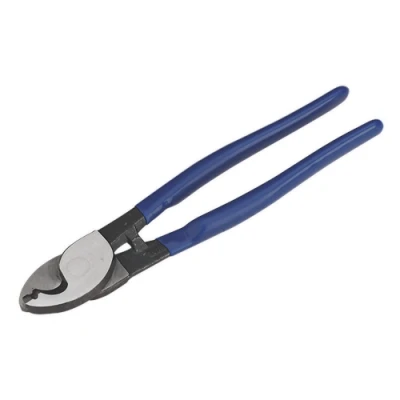 ManoManoGeneral description Sealey Premier Cable Shears are designed for cutting, stripping, and dismantling various materials. These shears are made from hardened and tempered high-grade steel, featuring precision ground cutting edges and dipped handles for enhanced grip and comfort. Technical specifications Model No.: AK8358 Material: Hardened and tempered high-grade steel Length: 250mm EAN: 5024209578707 Usage These cable shears are suitable for cutting: Steel rope Thin steel rod Copper wire Aluminium wire Other information