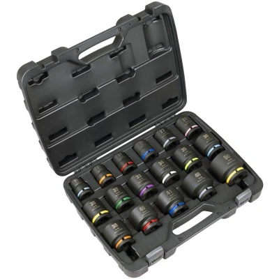 Manufactured from hardened and tempered Chrome Molybdenum steel with a phosphate finish for added corrosion resistance. 6-Point WallDrive® sockets allow a transfer of up to 30% more torque to the fixing. Colour-coded rings and enlarged socket size text for fast identification. Supplied in storage case. SEALEY PREMIER - One of a comprehensive range of Premier Hand Tools suitable for daily, professional use. HARDENED AND TEMPERED CHROME MOLYBDENUM STEEL - For strength and durability. IMPACT GRADE - Suitable for use with any impact tool. PHOSPHATE FINISH - For added corrosion resistance. 6-POINT WALLDRIVE® SOCKETS - Allow up to 30% more torque to the fixing. COLOUR-CODED WITH ENLARGED SOCKET SIZE PRINT - For quick and easy identification. COMPREHENSIVE 17PC SET - Standard Sockets; 19, 21, 22, 24, 27, 29, 30, 32, 33, 34, 35, 36, 38, 40, 41, 46, 50mm. SUPPLIED IN STORAGE CASE - For easy storage solutions. LIFETIME GUARANTEE*.