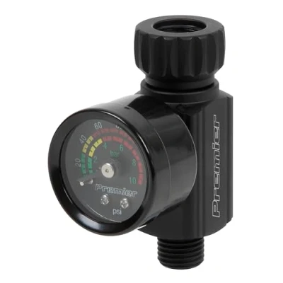 KNURLED THUMB SCREW - For toolless connection to your spray gun. GLASS GAUGE LENS - Provides more resistance to solvent vapours ON-GUN DESIGN – Couples directly to spray gun air inlet to control air flow and pressure. EASY TO READ GAUGE – Colour coded pressure gauge to aid set-up. HIGH PRESSURE – Maximum operating pressure of 140psi. Allowing use with both spray guns and air tools. HGH FLOW- Maximum flow rate of 17cfm @ 60psi. Ideal for most paint spraying applications.