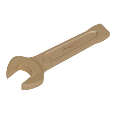 ManoManoGeneral description Sealey Premier Non-Sparking Open-End Slogging Spanner is designed for heavy-duty applications, manufactured from Beryllium Copper to ensure safety in environments where sparks could pose a risk. This tool is ideal for tightening or loosening large nuts or bolts when used with a non-sparking hammer. Technical specifications Material: Beryllium Copper Length: 190mm Size: 30mm Model No.: NS020 EAN: 5054511731705 Usage This spanner is specifically used with a non-sparking hammer to safely tighten or loosen large nuts or bolts, making it suitable for daily professional use in various industries. Other information