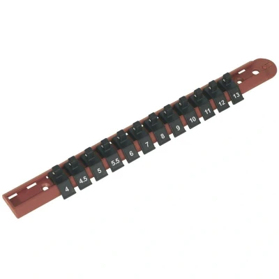 ManoManoGeneral description Sealey's Socket Retaining Rail with 12 Clips is designed for durability and ease of use. This sliding socket rail is made from a robust composite material, ensuring it withstands daily professional use. Each socket clip features the size printed directly on it for quick and easy selection, making it an essential tool for any workshop. Technical specifications MPN: AK1412 EAN: 5024209797269 Drive Size: 1/4" Square Drive Number of Clips: 12 Socket Size Range: 4-13mm Compatibility and accessories Compatible with standard 1/4" square drive sockets. Installation Drilled rail allows for wall mounting or cabinet fixing. Usage Ideal for organizing and storing sockets in workshops or garages. Other information Lifetime guarantee*