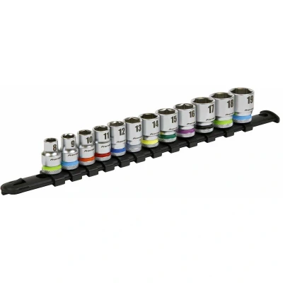 The Premier Socket Set is an essential addition to any professional toolbox, designed for daily use and reliability. This comprehensive 12-piece set features a 3/8" square drive and is crafted from hardened and heat-treated Chrome Vanadium steel, ensuring both strength and durability. Each socket in the set boasts a fully polished micro satin finish, providing a sleek aesthetic while also enhancing resistance to corrosion and wear.