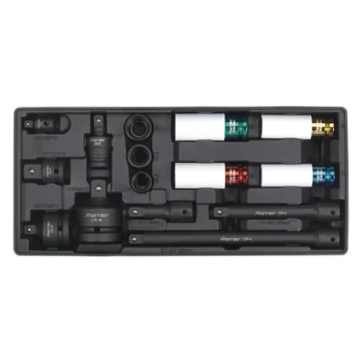 - Contents: The tool tray comes equipped with a 15-piece Impact Socket and Adaptor Set, which includes:
