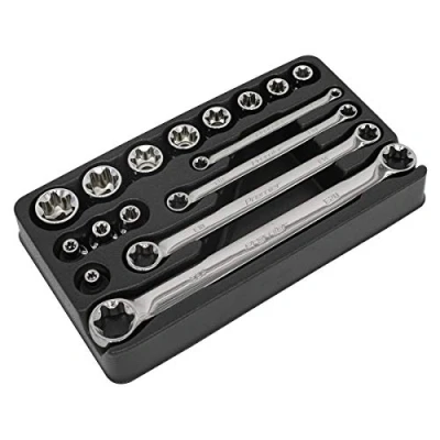 AmazonFeatures:Manufactured from Chrome Vanadium steel with a fully polished finish for corrosion resistance Twelve 3/8IN Sq drive sockets and four double end spanners covering TRX-Star* fixings E6-E24 Knurled ring on sockets for extra grip with greasy fingers Supplied in storage tray Specifications:Model No: AK61801TRX-Star* Sockets: 3/8"Sq Drive; E6, E7, E8, E10, E11, E12, E14, E16, E18, E20, E22, E24TRX-Star* Spanners: E6 x E8, E10 x E12, E14 x E18, E20 x E24Height: 309Width: 161Length: 37, Weight: 1.543235834 pounds, Manufacturer: Sealey