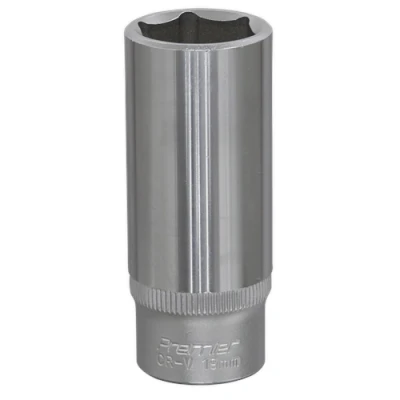 ManoManoGeneral description Sealey S3819D Premier Deep Socket is designed for professional use, featuring a cold-forged Chrome Vanadium steel construction for enhanced durability and strength. The socket is equipped with a WallDrive® configuration, which provides better grip and reduces the risk of rounding off fasteners. Technical specifications Drive Size: 3/8" Sq Material: Chrome Vanadium Size: 19mm Model No.: S3819D EAN: 5024209335874 Other information Lifetime guarantee* Half chrome, half satin finish with knurled ring for extra grip
