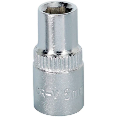 ManoManoGeneral description Sealey WallDrive Socket 6mm 1/4" Square Drive is designed for durability and efficiency. Made from cold-forged Chrome Vanadium steel, this socket is hardened and tempered for added strength, making it suitable for daily professional use. The unique WallDrive socket configuration enhances grip and torque, ensuring optimal performance. Technical specifications Material: Chrome Vanadium MPN: S1406 EAN: 5054511380927 Finish: Half chrome, half satin with knurled ring Other information Lifetime guarantee*
