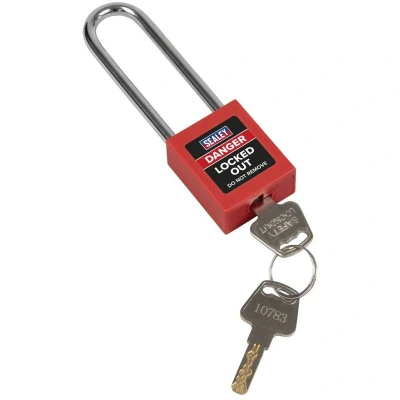 General description Sealey Long Shackle Safety Lockout Padlock is designed for the safe maintenance and repair of hazardous equipment, including electrical plug and switch lockouts. Its heavy-duty construction ensures reliability and safety during use. Technical specifications Model No.: EV12 Shackle diameter: 6mm Material: Heavy-duty red plastic casing Durability: Impact and heat resistant Usage Ideal for lockout/tagout procedures in maintenance and repair work. Wipeable label allows for job ownership and security. Supplied with two keys for added safety.