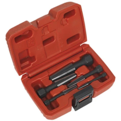 ManoManoGeneral description Sealey Double Edge Screw Extractor Set includes five pieces designed for the effective removal of tough bolts and screws. Each extractor features four double-edged cutting/gripping sides with eight points of contact, ensuring a non-slip engagement with the fasteners. The set is conveniently supplied in a storage case. Technical specifications Model No.: AK752 Contents: #1; 3.2-4.2mm (3/16"-1/4"), #2; 4.8-7.1mm (5/16"-3/8"), #3; 6.4-9.5mm (7/16"-1/2"), #4; 8.7-12.7mm (1/2"-9/16"), #5; 11.1-15.9mm (5/8"-3/4") EAN: 5054511017694 Other information