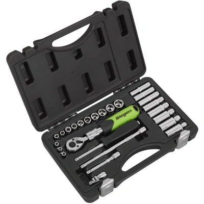 General description Sealey Siegen Extendable Ratchet Socket Set 1/4" Sq Drive 26pc is a professional socket set designed for durability and ease of use. Manufactured from hardened and heat-treated Chrome Vanadium steel, it features a fully polished mirror finish for corrosion resistance. This set includes a 72-tooth extendable ratchet wrench with flip reverse and push-button quick release, providing versatility and convenience for various tasks. Technical specifications Material: Hardened and heat-treated Chrome Vanadium steel Finish: Fully polished mirror finish Socket sizes: Standard (4, 4.5, 5, 5.5, 6, 7, 8, 9, 10, 11, 12, 13, 14mm) and Deep (6, 7, 8, 9, 10, 11, 12, 13mm) Ratchet wrench: 72-tooth extendable Extension bar lengths: 75mm and 150mm Model No.: S01286 Compatibility and accessories Includes extension bars (75mm and 150mm) Universal joint Spinner handle Installation Not applicable. Usage This socket set is ideal for automotive and mechanical applications, providing a range