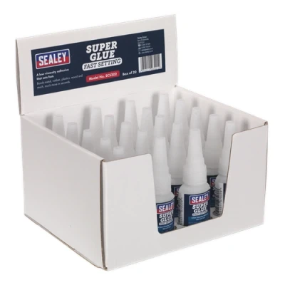 ManoManoGeneral description A low viscosity adhesive that sets fast, the Sealey SCS302 Fast Setting Super Glue is designed to bond materials such as metal, rubber, plastics, and wood in seconds. This product comes in a convenient pack of 20, making it ideal for various DIY and home improvement projects. Technical specifications Model No.: SCS302 Pack Quantity: 20