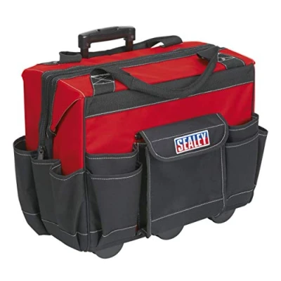 AmazonFeatures:Heavy-duty wheeled tool bag of rigid construction Multiple internal and external pockets Single compartment enclosed with a zip Strong carry handles and extendable metal handle for easy transportation Specifications:Model No: AP512Size (W x D x H): 450 x 260 x 420mmOuter Pockets: 11Inner Pockets: 9Height: 400Width: 486Length: 256, Weight: 9.5239697184 Pounds, Manufacturer: Sealey