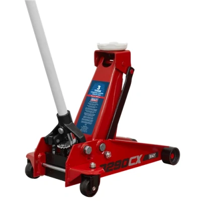 ManoManoGeneral description Sealey Roadmaster® Trolley Jack is a professional 3 Tonne jack designed for both roadside and workshop use. It features a single-piece hydraulic unit and an integral American cog-type release mechanism, ensuring ease of operation with reduced effort thanks to its long 2-piece handle. The jack is equipped with heavy-duty castors and a large saddle design for easy positioning under vehicles. Technical specifications Minimum Saddle Height: 130mm Maximum Saddle Height: 465mm Chassis Length: 572mm Weight: 27.4kg Model No.: 3290CX Other information Fitted with a safety overload valve and pump-through valve to prevent handle locking at maximum ram extension. Most compact and lightweight ALL STEEL Pro Trolley Jack on the UK market.