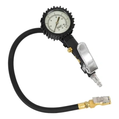 The gauge is fitted with a 500 mm flexible rubber hose, which allows for easy maneuverability and access to hard-to-reach valves. The single clip-on connector ensures a secure connection, reducing the risk of air leaks during operation.