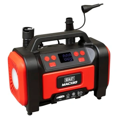 AmazonDUAL POWER – The unit can run from both mains power 230V AC and 12V plug for use in vehicle accessory power socket. 3 MINUTE INFLATION TIME – Inflates any Schrader valve on cars, vans, 4x4s, motorcycles and bicycles. EASY OPERATION - Works in four pressure units: psi, kPa, kg/cm² and bar with maximum pressure of 120psi. BACKLIT DISPLAY SCREEN – Easy-to-read large digital display screen. AUTO-SHUT-OFF – Unit features auto-shut-off when preset pressure is reached. COMPACT UNIT – Lightweight unit for easy transportability with accessories fixed to the housing for easy storage, with anti-vibration feet. WIDE COMPATIBILTY – Schrader connection, Presta type adaptor, ball spike and inflatable adaptor. INTEGRATED LED LIGHT – White SMD LED worklight with red SOS and red flashing light function., Manufacturer: Sealey