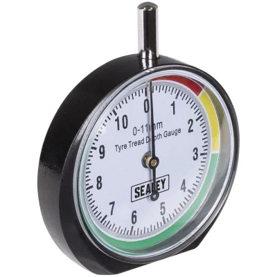 General description High accuracy readings are provided by the Sealey Pocket Type Tyre Tread Depth Dial Gauge. This gauge features a colour-coded tread depth design that helps users easily assess tyre health. Technical specifications Scale: 0-11mm in 1mm graduations Display: 45mm analogue Body: Heavy-duty steel Other information Supplied with a protective pouch for storage when not in use