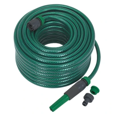 ManoManoGeneral description Sealey Water Hose 30m with Fittings is a durable and versatile hose designed for various watering tasks. Made from green PVC, it features a 12mm bore and is reinforced with polyester fiber for added strength. Technical specifications Length: 30m Bore Diameter: Ø12mm Material: Green PVC Construction: 3-ply polyester fiber reinforced Model No.: GH30R EAN: 5024209844482 Compatibility and accessories Includes spray/jet nozzle Female connector Waterstop connector Threaded tap connector Other information