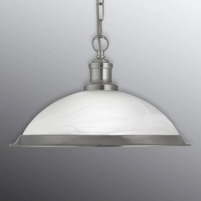Simply designed pretty Bistro hanging light in matt silver The mixture between the simple design and the modern colours make the matt silver Bistro hanging light a unique light source. The silver suspension chain allows you to adapt the pendant exactly to your home. The elegant white glass lampshade of the hanging light adjoins the practical rustic-appearance chain. A fine marble pattern was integrated as additional decoration to give the light a slightly playful appearance. The lampshade is completed by a slim metal strip, which is also silver. Inside the lampshade is the E27 socket for the bulb, which shines a cosy light when you switch it on.