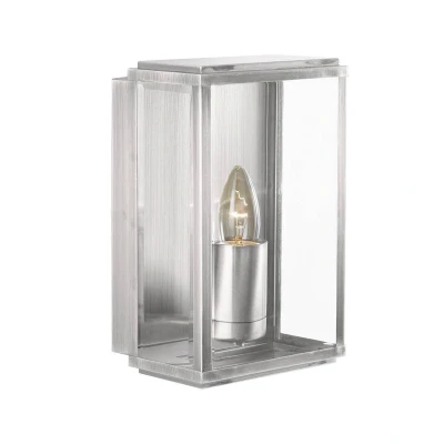 This Satin Silver Rectangular Outdoor Light with Clear Bevelled Glass is simple, classic and elegant. The sleek metal box features clear bevelled glass panels around the sides and is lit by an attractive candle style light fitting. It's perfect for lighting your outdoor walls and is IP44 rated and fully splash proof to protect against the elements.