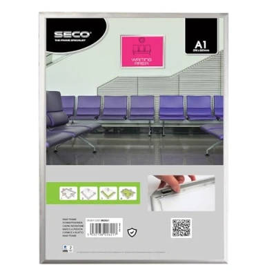 Easy open 'snap opening' Front frame, to Quick poster change Satin anodised aluminium frame in Silver 400 micron anti-glare PVC front sheet Tough Styrene back panel, to hold your A1 sized poster in place Complete with screws and raw plugs to secure your frame to the wall Quick snap spring hinged front load frame allows for easy and quick poster change outs No need to remove the frame from the wall when changing posters Durable Silver Satin anodised aluminium frame Posters are kept clean behind a UV resistant, anti-glare Perspex safety glass front sheet, which is flexible and resistant to breakages Comes with screws and raw plugs - can be positioned portrait or landscape