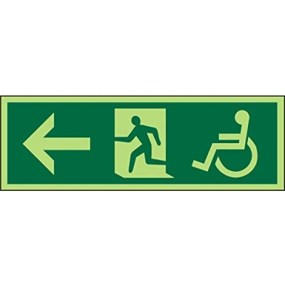 Seco DDA Fire Exit Arrow Pointing Left, Man Running Wheel Chair Pictogram Sign, 450mm x 150mm Photoluminescent Self Adhesive Vinyl