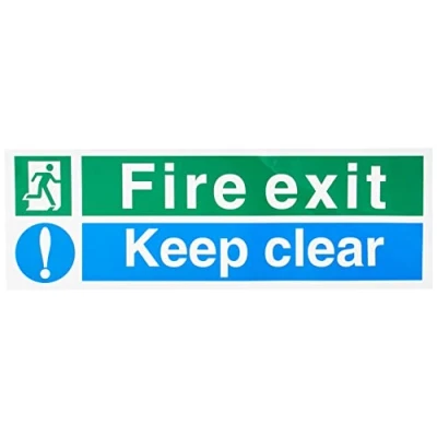 Seco Fire Exit Exclamation Mark, Keep Clear Sign, 450mm x 150mm Self Adhesive Vinyl,Blue/Green
