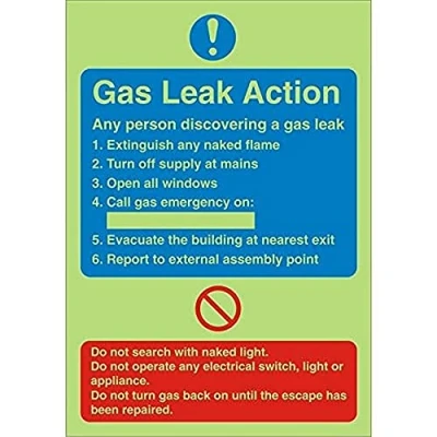 Seco Gas Leak Action Sign, 150mm x 200mm Photoluminescent 1mm Semi Rigid Plastic