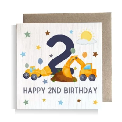 2nd Birthday Digger square card. Premium quality, printed on 350GSM linen card. Card size approx : 148.5mm x 148.5mm. Cards are left blank in the middle and come with a brown envelope. Cards are made from FSC certified card and are fully recyclable. Made by Second Ave Gift Company in our Essex based workshop. Search for Second Ave Gift Company to see our full range of gift ideas.