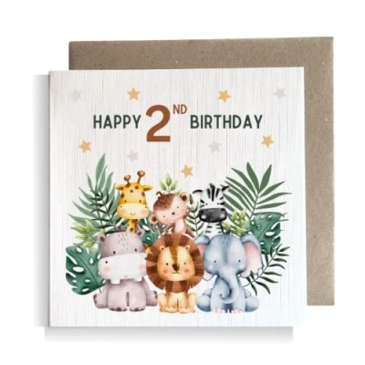2nd Birthday safari square card. Premium quality, printed on 350GSM linen card. Card size approx : 148.5mm x 148.5mm. Cards are left blank in the middle and come with a brown envelope. Cards are made from FSC certified card and are fully recyclable. Made by Second Ave Gift Company in our Essex based workshop. Search for Second Ave Gift Company to see our full range of gift ideas.