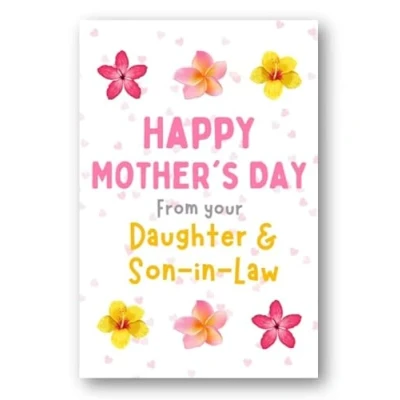 Happy Mother's Day flower card from Daughter & Son in Law. Premium quality, printed on 350GSM linen card. Card size: 210mm x 148mm. Cards are left blank in the middle and come with an envelope. Cards are made from FSC certified card and are fully recyclable. Made by Second Ave Gift Company in our Essex based workshop. Search for Second Ave Gift Company to see our full range of gift ideas.