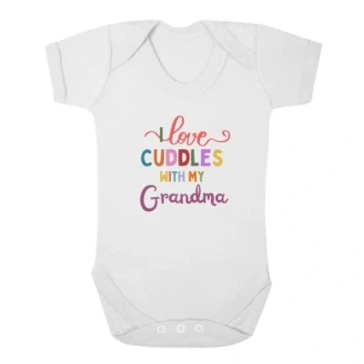 Cute shortsleeve baby bodysuit. I Love Cuddles With My Grandma design. Made from 100% cotton. Available in various sizes. Designed and made by Second Ave Gift Company in our Essex based workshop. Search for Second Ave Gift Company to see our full range of gift ideas.