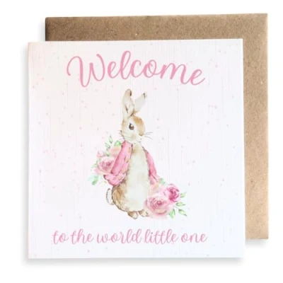 Pink bunny rabbit new baby girl square card. Premium quality, printed on 350GSM linen card. Card size approx : 148.5mm x 148.5mm. Cards are left blank in the middle and come with a brown envelope. Cards are fully recyclable. Search for Second Ave Gift Company to see our full range of gift ideas.