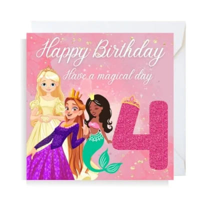 4th Birthday princess card. Premium quality, printed on 300GSM matte card. Card size approx : 145mm x 145mm. Cards are left blank in the middle and come with a white envelope. Cards are fully recyclable. Search for Second Ave Gift Company to see our full range of gift ideas.
