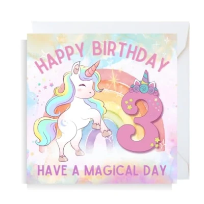 3rd Birthday unicorn card. Premium quality, printed on 300GSM matte card. Card size approx : 145mm x 145mm. Cards are left blank in the middle and come with a white envelope. Cards are fully recyclable. Search for Second Ave Gift Company to see our full range of gift ideas.