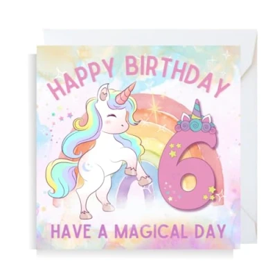 6th Birthday unicorn card. Premium quality, printed on 300GSM matte card. Card size approx : 145mm x 145mm. Cards are left blank in the middle and come with a white envelope. Cards are fully recyclable. Search for Second Ave Gift Company to see our full range of gift ideas.