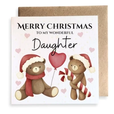 Daughter bear Christmas square card. Premium quality, printed on 350GSM linen card. Card size approx : 148.5mm x 148.5mm. Cards are left blank in the middle and come with a brown envelope. Cards are fully recyclable. Search for Second Ave Gift Company to see our full range of gift ideas.