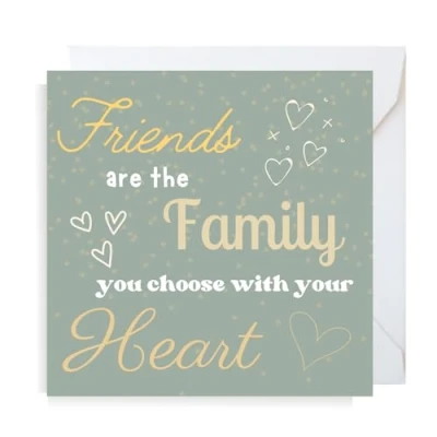 Friends are the family you choose birthday square card. Premium quality, printed on 300GSM matte card. Card size approx : 145mm x 145mm. Cards are left blank in the middle and come with a white envelope. Cards are made from FSC certified card and are fully recyclable. Made by Second Ave Gift Company in our Essex based workshop. Search for Second Ave Gift Company to see our full range of gift ideas.