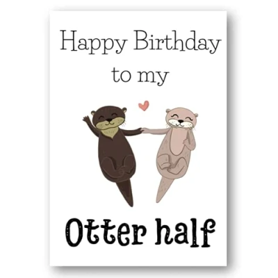 Funny/cute otter half joke Happy Birthday partner card. Premium quality, printed on 350GSM linen card. Card size: 210mm x 148mm. Cards are left blank in the middle and come with an envelope. Cards are made from FSC certified card and are fully recyclable. Made by Second Ave Gift Company in our Essex based workshop. Search for Second Ave Gift Company to see our full range of gift ideas.