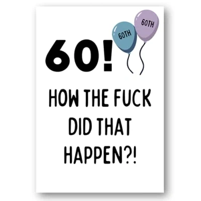 Funny/rude 60th how did that happen joke Happy Birthday card. Premium quality, printed on 350GSM linen card. Card size: 210mm x 148mm. Cards are left blank in the middle and come with an envelope. Cards are made from FSC certified card and are fully recyclable. Made by Second Ave Gift Company in our Essex based workshop. Search for Second Ave Gift Company to see our full range of gift ideas.