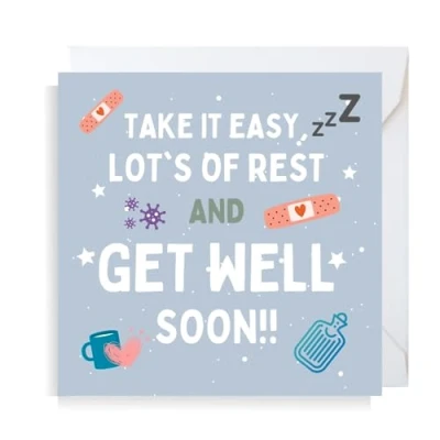 Get well soon square card. Premium quality, printed on 300GSM matte card. Card size approx : 145mm x 145mm. Cards are left blank in the middle and come with a white envelope. Cards are made from FSC certified card and are fully recyclable. Search for Second Ave Gift Company to see our full range of gift ideas.