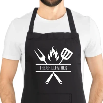 Men's black cooking apron. Funny Grillfather design. Made from 65% Polyester and 35 % Cotton Twill. One size fits all - width 72cm, length 86cm. Designed and made by Second Ave Gift Company in our Essex based workshop. Search for Second Ave Gift Company to see our full range of gift ideas.