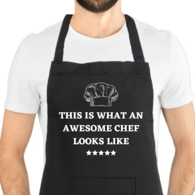 Black unisex cooking apron. Funny this is what an awesome chef looks like design. Made from 65% Polyester and 35 % Cotton Twill. One size fits all - width 72cm, length 86cm. Designed and made by Second Ave Gift Company in our Essex based workshop. Search for Second Ave Gift Company to see our full range of gift ideas.