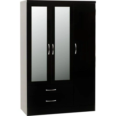 General description The Nevada 3 Door 2 Drawer Mirrored Wardrobe combines style and functionality, featuring a sleek black gloss finish and ample storage space. Technical specifications Dimensions: L52 x W116 x H182.5 cm Weight: 73.95 kg Material: Composite board with plastic veneer MDF back panel and drawer base Metal handles, hinges, and drawer runners Plastic feet Mirror size: W250 x H1200 mm Anti-tip strap included