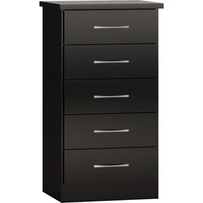 General description The Nevada 5 Drawer Narrow Chest is a stylish and functional storage solution designed to fit in tight spaces. With its sleek black gloss finish, it adds a modern touch to any room while providing ample storage with five spacious drawers. Technical specifications Dimensions: L40 x W50 x H93 cm Weight: 22.9 kg Material: Composite board with plastic veneer MDF back panel and drawer base Metal handles and drawer runners Plastic feet and back panel strip