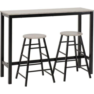 General description The Athens Breakfast Bar Set features a stylish concrete effect with black accents, making it a perfect addition to modern kitchens and dining areas. Technical specifications Material: MDF with paper veneer and metal Table dimensions: L40 x W120 x H90 cm Bar stool dimensions: L40 x W40 x H60 cm Total weight: 18.85 kg