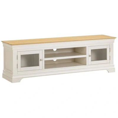 Add a touch of classic elegance to your living room with this beautifully designed pre-assembled TV stand, offered in your choice of Pebble Grey or Ivory. Featuring a solid oak top, this piece brings natural warmth and contrast to its painted frame, making it a stylish and functional centerpiece for any space. The unit includes two glass-fronted cabinets with a choice of handle finishes, perfect for storing media accessories, while the central open shelves provide easy access and include cable management cut-outs to keep wires neatly tucked away. Delivered fully assembled for your convenience, this TV stand is part of a wider collection that includes matching coffee tables, side tables, and bookcases, allowing you to create a coordinated and inviting living area. Product Material: Oak/Hardwood/Plywood Back Panel/Metal and Wooden Handles/Glass/Plastic Feet/Painted Finish (Matt) Dimensions & Weight: Dimension: L43 x W180 x H56 cm Weight: 33 kg . Bordeaux TV Stand - Ivory/Oak . Delivery
