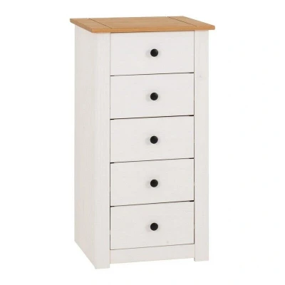 General description The Panama 5 Drawer Chest is a stylish and functional storage solution, perfect for organizing your belongings while adding a touch of elegance to your space. Technical specifications Dimensions: L44 x W46 x H89.5 cm Weight: 14.19 kg Material: Pine plywood back panel and plywood drawer base Metal handle