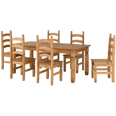 General description The Corona 6 feet Dining Set is crafted from distressed waxed pine, offering a rustic yet elegant addition to your dining area. This set includes a spacious table and comfortable chairs, perfect for family gatherings or entertaining guests. Technical specifications Table Dimension: L92 x W182 x H75.5 cm Chair Dimension: L47 x W42 x H107 cm Total Weight: 43.1 kg