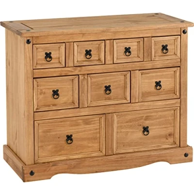AmazonDistressed waxed pine chest consisting of nine varied sized drawers with metal handles and studs W 1010 mm x D 455 mm x H 825 mm Plywood back panel/drawer bases Pine drawer runners Self assembly